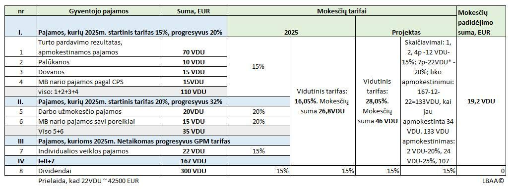 8. Ir toliau lieka didesni CPS (MB) narių apmokestinimas: 15 % iki 12 VDU, o po to įsijungia progresyvus tarifas: 25 % - 36 VDU, 32 % - 60 VDU, vertinant visų gyventojo pajamų krepšelį. Dabar CPS taikomas 15 %, kurio progresyvumas įsijungia prie 120 VDU, kai vertinamas 15 % kitų pajamų krepšelis.