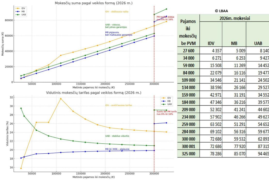 🧐 Skaičiavimai rodo, kad 2026 m. IDV atveju mokesčiai bus didesni nei MB ar UAB visada, kai metinės pajamos iki mokesčių yra intervale nuo 34000 Eur iki 300‘000 Eur.