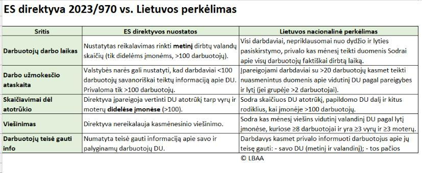 📌 ES direktyva (2023/970) reikalauja tik metinių duomenų iš didelių įmonių (>100 darbuotojų), tačiau Lietuva pasirinko daug platesnę prievolę.