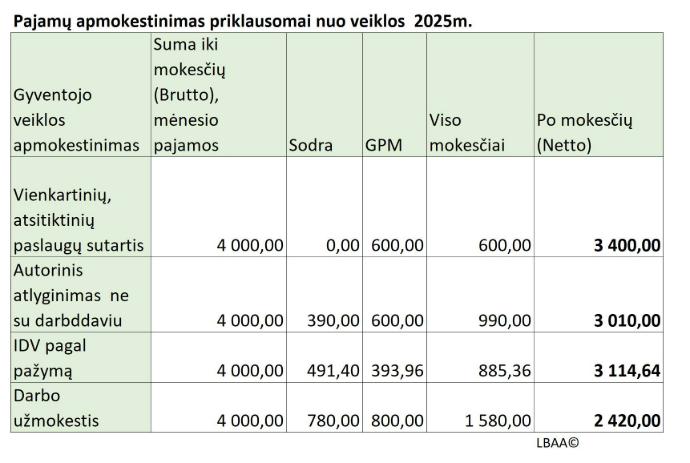 Nuo pasirinktų teisinių ir mokestinių santykių priklauso, kiek realiai lieka pajamų po mokesčių. Skirtumus lemia socialinio draudimo įmokos, GPM tarifai ir taikomos ar netaikomos lengvatos.