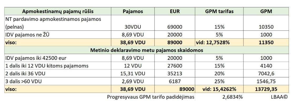 • 69 000 Eur apmokestinamųjų pajamų iš NT pardavimo (GPM lengvata netaikoma).