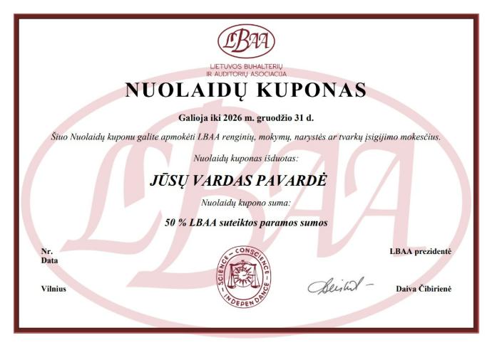 Užpildę FR0512 formą ir paskyrę GPM dalį LBAA, įgyjate teisę gauti 🎁 „LBAA nuolaidų kuponą“, kurio vertė – net 50% jūsų skirtos paramos sumos!
