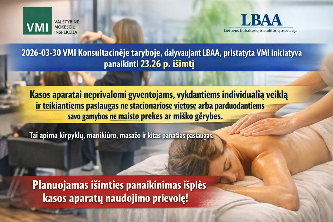 2026-03-30 VMI Konsultacinėje taryboje, kurioje dalyvauja LBAA, buvo pristatyta VMI iniciatyva panaikinti išimtį, nustatytą Atsiskaitymų už prekes ir paslaugas duomenų fiksavimo tvarkos aprašo 23.26 punkte, reglamentuojančią atvejus, kai išmaniųjų kasos aparatų naudojimas nėra privalomas.