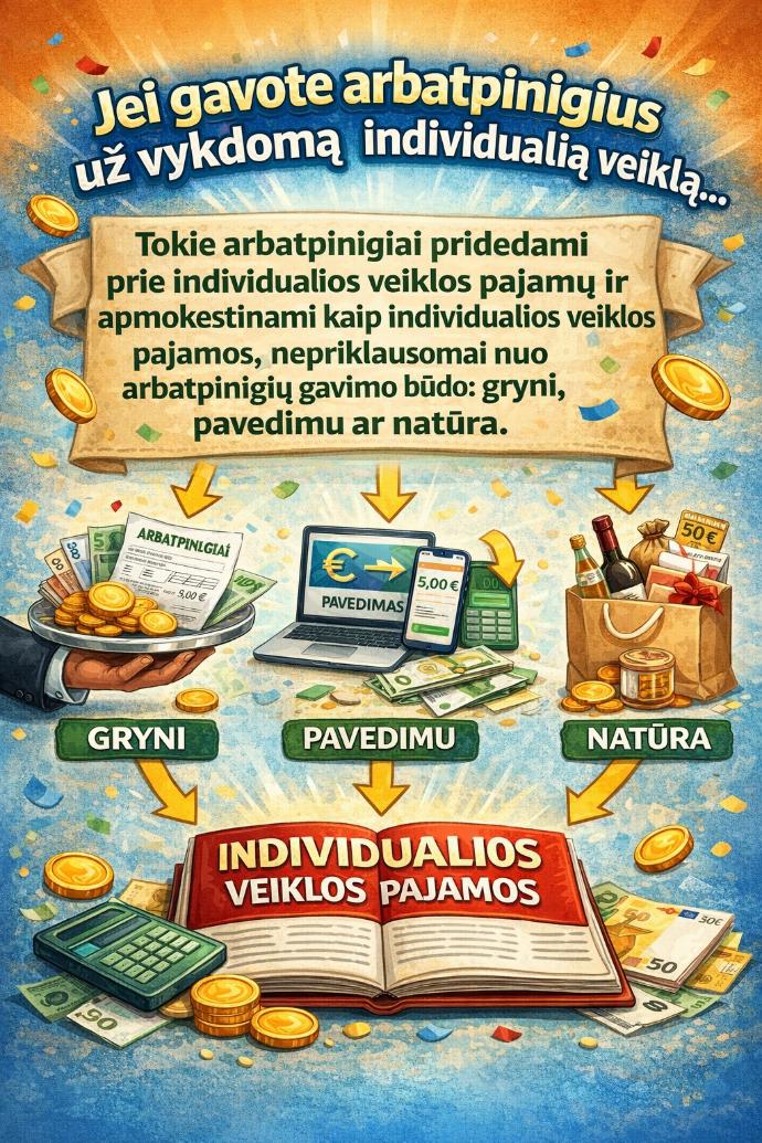 Jei gavote arbatpinigius už vykdomą individualią veiklą, tokie arbatpinigiai pridedami prie individualios veiklos pajamų ir apmokestinami kaip individualios veiklos pajamos, nepriklausomai nuo arbatpinigių gavimo būdo: gryni, pavedimu ar natūra.